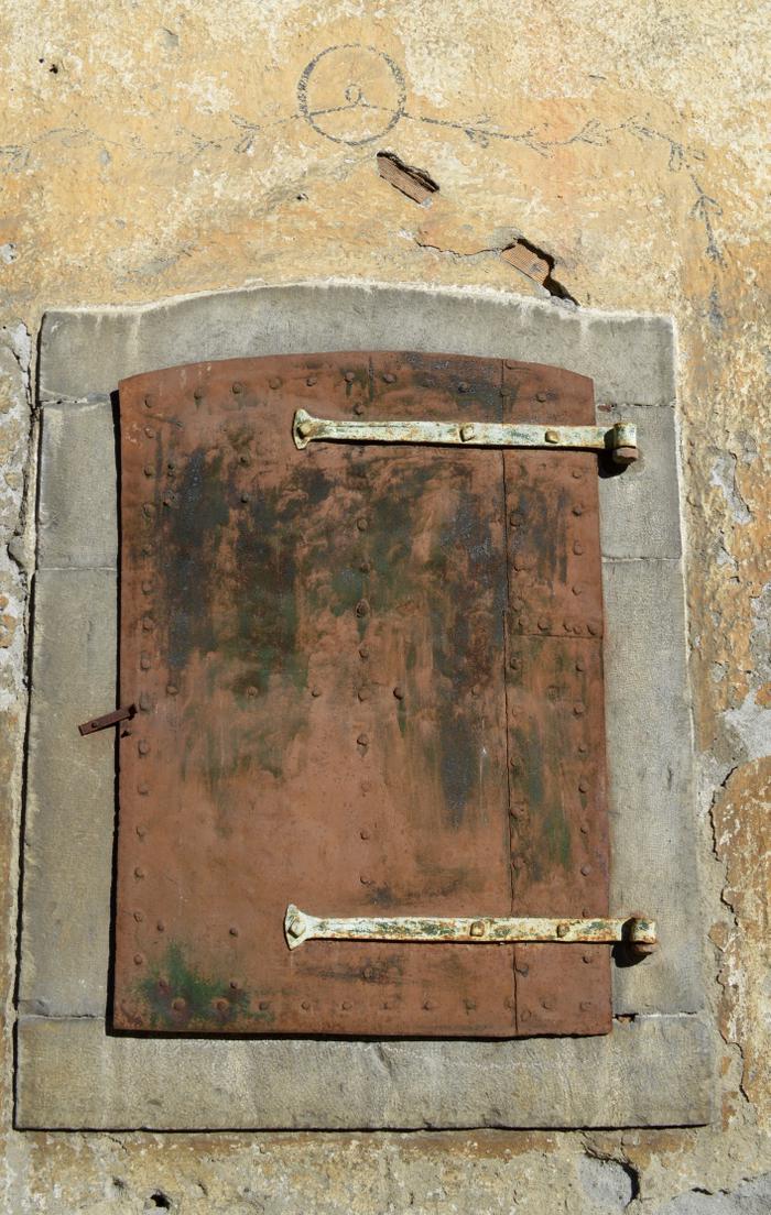 Vieux volet métallique ; Frise symbole et végétal, peinture murale à la main.